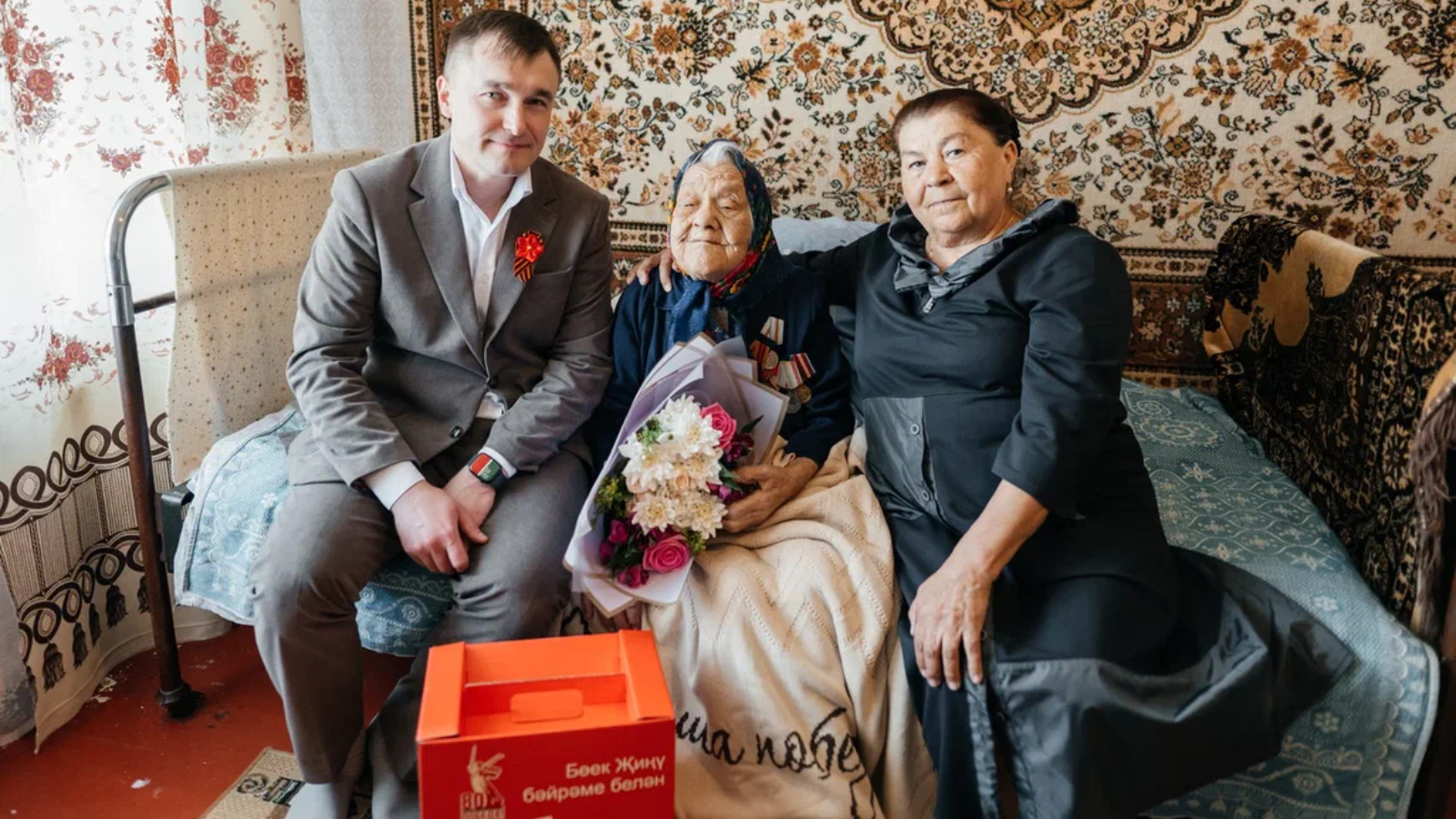 Рәхмәт сүзләре белән ветеранга истәлекле бүләк, чәчәк бәйләме тапшырылды.