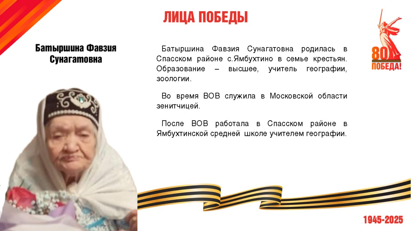 Батыршина Фәүзия Сөнәгатовна – хезмәт ветераны, 40 елга якын мәгариф өлкәсендә эшләгән. Фронтка киткәндә аңа 18 яшь була. Җиңү көне алдыннан Салават Күпере поликлиникасы хезмәткәрләре аның янына сәламәтлеген белешү һәм бөек бәйрәм белән котлау өчен килделәр.