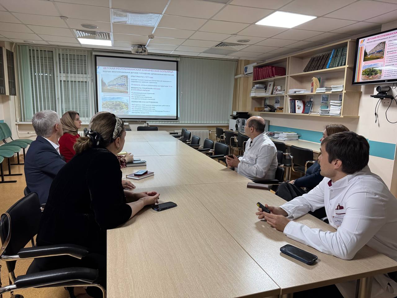 Республика балалар клиник хастаханәсе баш табибы урынбасарлары кунакларга хастаханәнең структур бүлекчәләре һәм хезмәтләре арасындагы үзара бәйләнешне системалаштыру турында сөйләделәр, клиниканың төп күрсәткечләре булган презентацион материаллар һәм фильм күрсәттеләр, кабул итү-диагностика, яңа туган балаларны реанимацияләү, комплекслы реанимация үзәге һәм башка бик күп бүлекләрнең эше белән таныштырдылар.