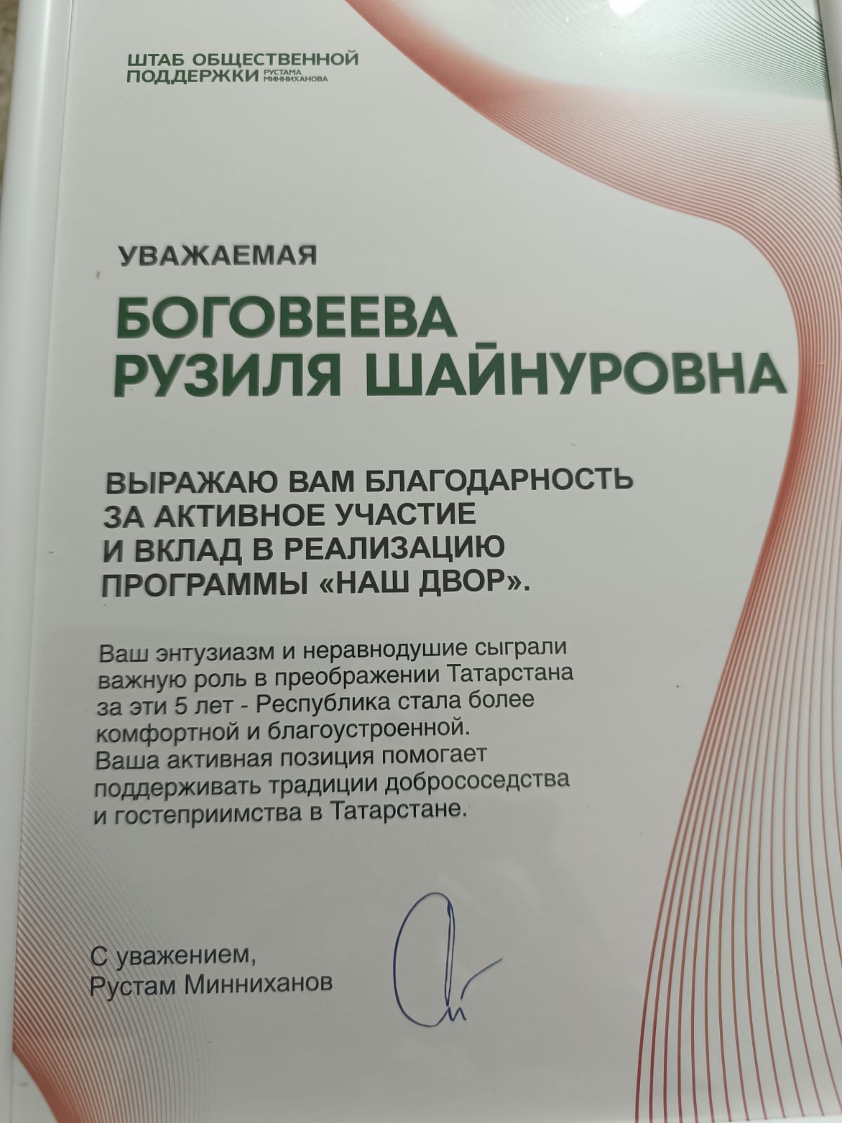 Безнең коллегалар ярдәмендә хастаханәнең тышкы кыяфәте һәм территориясе елдан-ел үзгәрә бара. Хастаханә хезмәткәрләре шулай ук үз ишегалларын төзекләндерүдә катнаштылар. Татарстан Республикасы Рәисе Рөстәм Нургали улы Миңнеханов исеменнән баш табибның административ-хуҗалык юнәлеше буенча урынбасары Фәнил Габдулла улы Фәрхетдинов һәм стационарның неврология бүлеге табиб-неврологы Рузилә Шәйнур кызы Боговеева рәхмәт хатлары алдылар.