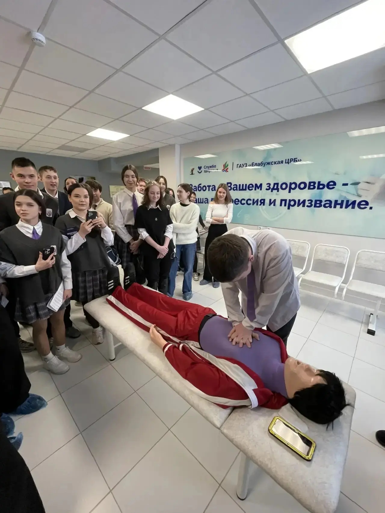 Район үзәк хастаханәсендә ачык ишекләр көне кысаларында шәһәр һәм район мәктәп укучылары медицина һөнәре дөньясына кереп китә алдылар. Табиб‑анестезиолог‑реаниматолог Дилүс Җиһаншинның йөрәк‑үпкә реанимациясе техникасына багышланган мастер‑классы балаларга аеруча тәэсир итте.