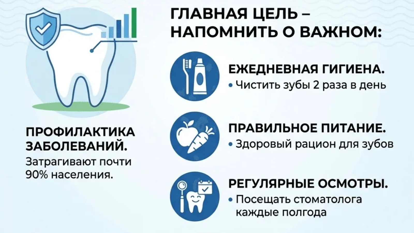 Хәтта идеаль гигиена да стоматологка елына 1-2 тапкыр килүне алмаштырмаячак. Профессиональ чистарту үзе эреми торган ташны чистарта, авырулар куркынычын 80% ка киметә. Проблемаларны иртә ачыклау (рентген, карау) катлаулануларны булдырмый кала. 1 яшьтән башлап балалар өчен — фторлау, өлкәннәр өчен – фиссурларны герметизацияләү.
